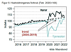 Under pandemien ble varekonsumet både i Norge og globalt svært høyt som følge av at tjenestesektoren ble stengt ned. I kjølvannet av at tjenestesektoren har åpnet opp igjen, har folk strømmet tilbake til restauranter og hotell, og varekonsumet har blitt nedprioritert. Siden årsskiftet har dermed varekonsumet trendet nedover, mens tjenestekonsumet har trendet opp (Fig.5).
