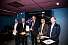 AVTALE SIGNERT: Fra venstre: Øystein Jahr, administrerende direktør Naval Dynamics, Jan Eyvin Wang, konserndirektør Wilhelmsen, Knut Eriksmoen, administrerende direktør DB Schenker Norge, Geir Håøy, konsernsjef Kongsberg Gruppen og Roger Lunde, administrerende direktør Ekornes.
