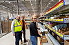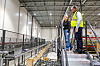 SYDD SAMMEN: Logistikkdirektør Ane Wisløff-Høgestøl viser den delen av plukkprosessen som fortsatt er bittelitt manuell, mens EABs Runar Bøe og Øystein Granslo følger med. EAB har levert gjennomløpsreolene det her plukkes fra, mens Knapp har levert automasjonen, blant annet conveyoren som sørger for at rett eske kommer til rett plukker på rett posisjon. Eskene svinger innom er om manuelt plukk er nødvendig etter at A-frame-løsningen har levert de varene den ska.