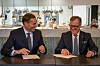 Jan van der Burg (til venstre) fra Servicegrossistene og Morten Thorvaldsen fra Thon Hotels markerer starten på et nytt samarbeid. Kontrakten ble signert på Osteria della Nonna på Thon Hotel Rosenkrantz
