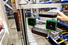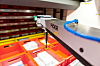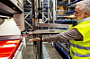 PROSESSEN: Hos Veso Apotek plukker Benjamin fra fire Logimater, tre på høyre side og én på venstre side innerst. Varene levers til kasser i gjennomløpsreoler, og når ordren er ferdig dytter Benjamin kassen videre til kontroll, og henter en ny tom kasse fra reolen over. Legg også merke til skinnen i gulvet der roboten går, denne kan dekkes til så manuelle plukkere kan ta over om ønskelig.Foto: Øyvind Ludt