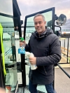 Jif-en ligger kanskje ikke heeelt naturlig i hånda på Brubakkens salgssjef, men Jan Ove Ekerhaugen demonstrerer at litt ekstra vindusvask er en av få ulemper med nye Kamag PT. Det er så mye vinduer i hytta som sikrer god sikt, at Jif-en må frem titt og ofte. Ekerhaugen har klart å pusse rutene såpass at Brubakkens daglige leder Anders Henni skimtes i speilbildet.