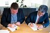 Palle Laursen (t.v.), teknisk sjef for flåten i Maersk signerer bestillingskontrakten med Hyundai Heavy Industries Co., Ltd.