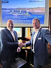 Are Gråthen, Samskip-sjef i Norge (t.h.) og Oskar Mykland, CFO Red Rock - Part of Ocean Infinity, har inngått samarbeid om to hydrogendrevne containerskip.