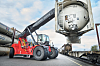 Taulov Kombiterminal har inngått leasingavtale på to Konecranes reachstackere med Flow Drive fra N.C. Nielsen. Den kraftige maskinen løfter uanstrengt en sementcontainer på rundt 38 tonn – den grønne omstillingen er i full gang.Foto: Gert Laursen