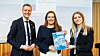 Fiskeri- og havminister Marianne Sivertsen Næss tar i mot Rederiforbundets konjunkturrapport fra adm. direktør Knut Arild Hareide og rådgiver Heidi Kaspara Kilemo.