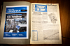 ETT BLAD – TRE NAVN: Glenn Lund (til venstre) er redaktør i Logistikk Inside og har tidligere vært redaktør i Moderne Transport. Øyvind Ludt har vært redaktør i Moderne Transport siden 2016, men har nå døpt om produktet til Tidsskriftet Logistikk. Bakerst forsiden på den aller første utgaven fra 1968, med navnet Transport og lager.Foto: Terje Ruud