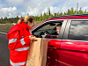 Vegdirektør Ingrid Dahl Hovland deler ut blomster til den første bilen som kjørte sørover etter den offisielle åpningen av veien onsdag 2. juli.Foto: Eirik Natlandsmyr / Statens vegvesen